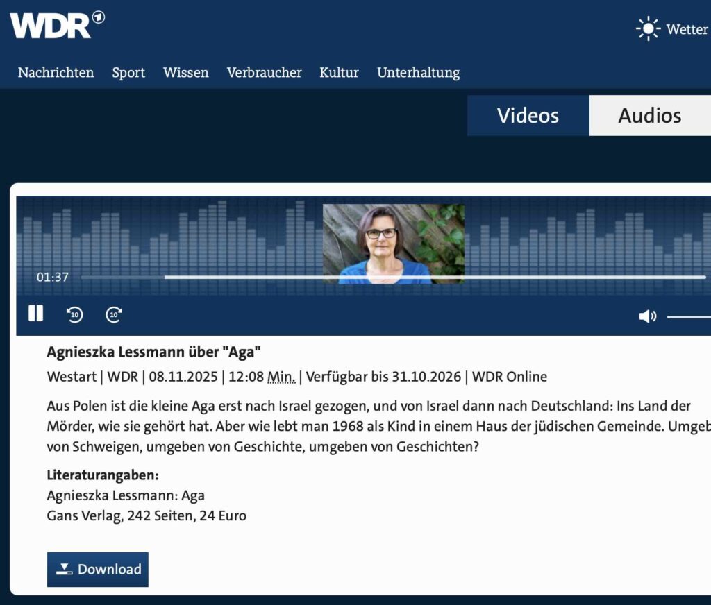 Uli Hufen hat für die WDR-Sendung Westart Lesen mit mir über den Roman „Aga“ gesprochen, über die historischen Hintergründe und die ganz gegenwärtigen Bezüge und darüber, warum ich den Roman erst jetzt zu Ende schreiben konnte.